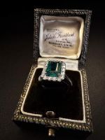 L’incassatura, elegante e perfettamente calibrata, crea un delicato contrasto tra il bianco luminoso dei diamanti e il verde profondo della pietra centrale, amplificando la brillantezza complessiva e donando all’anello un equilibrio visivo di grande impatto.