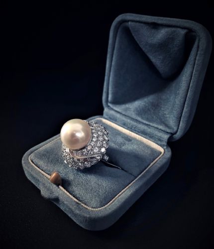 Anello in Platino con Perla da 13.5 mm e Diamanti 4.5 ct.